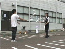 はじめまして。ジャグリングチーム螺鈿(らでん)です。私たちは部でも愛好会でないサークルのようなもので、毎週火曜日に体育館の端のほうを借りて練習会を開いています。5年M 堀口 航平