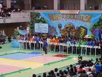 さて、今回の高専ロボコンのテーマは“生命大進化”です。ルールは、4本足以上の多足で歩行して三角錐のパイロンを1周、その後ハードルを越え (越え方は自由)2足の何かに進化させ2足歩行でゴールをする。という2チーム対抗のスピード競争です。